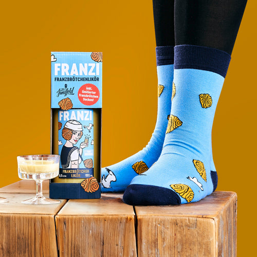 In unserer Franzi Geschenk-Box erhaltet ihr eine Flasche 0,5l Original Franzi Franzbrötchenlikör und ein Paar Socken im Franzbrötchen-Style in Kooperation mit dem namenhaften Sockenhersteller Von Jungfeld.